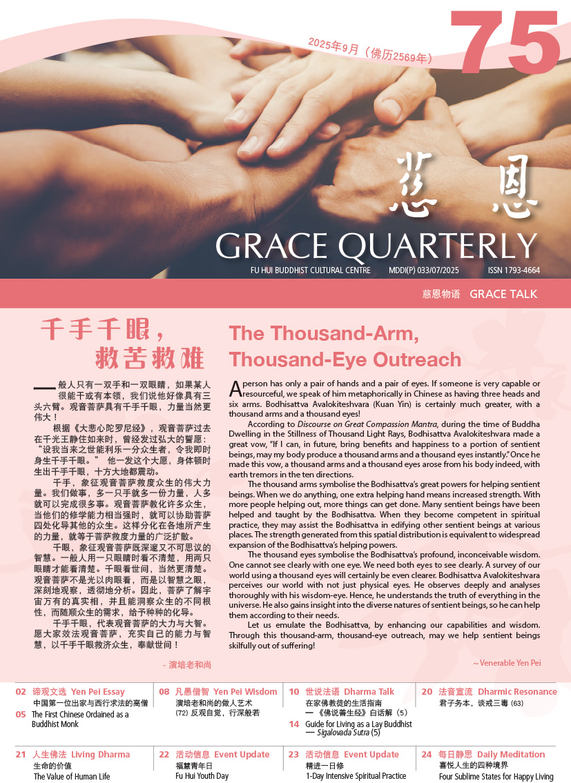 《慈恩》季刊 《慈恩》创刊于1982年,最初以月刊形式发行,在2007年改为季刊,每年出版四期(三月刊、六月刊、九月刊和十二月刊)。 《慈恩》的出版宗旨,在于宣扬佛教的正法正知见,并期以般若文采,滋润读者的法身慧命,为红尘俗世注入一股潺潺清流…… 联系我们: fhbcc@fhbcc.org.sg 欢迎询问和提供意见。 如果您要免费订阅《慈恩》电子季刊,请点击这里。